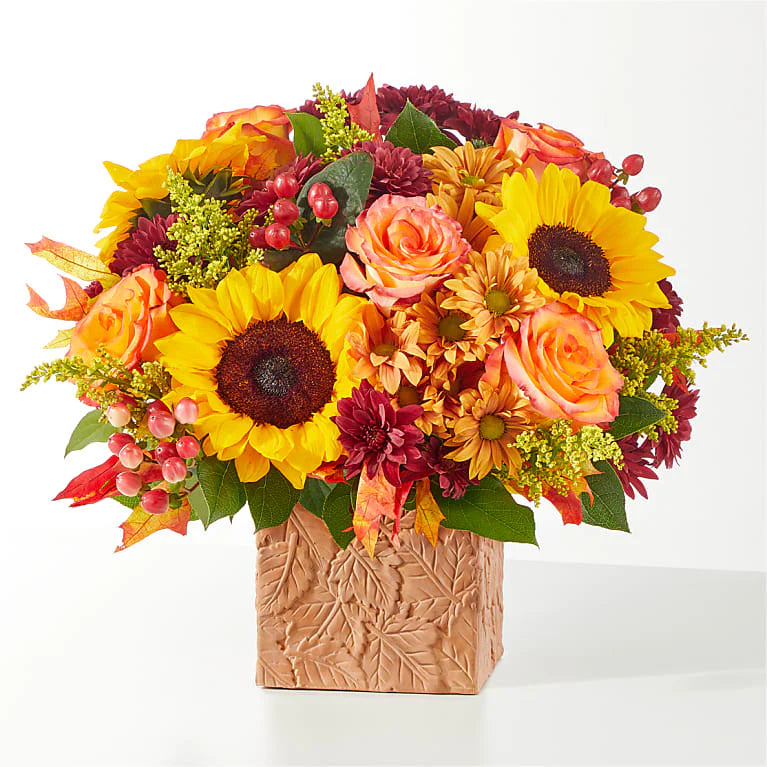 Embrace the season with this autumn blend of sunflowers, orange roses and burgundy mums to bring a piece of the outdoors in.